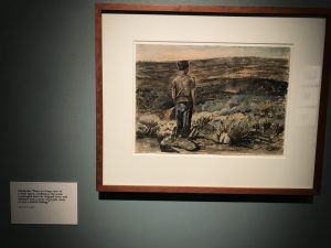 Minidoka No. 5 (442nd) 1979, instantly caught my eye during my journey through the museum. It is a combination of pop art style and simplicity, with bright, vivid colors and comic book aesthetics. Shimomura attempted to “confront the stereotypes about Asian Americans and explores the history, impact, and legacy of racism in America”. The piece of art reflects Japanese American men who were asked to serve in the U.S. Army in World War II even though during this same time had been imprisoned by the U.S. government because of their Japanese ancestry.