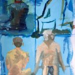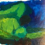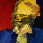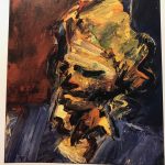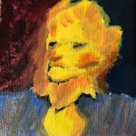 For week 5 I chose Frank Auerbach, Head of Catherine Lampert from Painting Today, p 174. My process for this copy was to just map out the form with a dark blue color and paint the base coat of color generally in that area. It didn’t work so well when i started putting the yellow on the blue. So, for the second I under painted in black acrylic and then glazed over the top. It turned out my first was a semi decent copy of the original and that my creative copy did put a more recognizable figure out. I figured the thing that was important to Auerbach was the shape of the hair and the shirt. So, that’s what I focused on. After about a hour on the first copy and struggling to get it right I quit and I really like that I finally gave up and moved on. I feel like I learned his point.