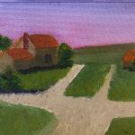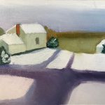 Week three had a set of copies of Maureen Gallace’s painting Down the Road from my Brother’s House, 2002, The first picture on the left was a copy I made to completely replicate her painting in color, value, brush strokes, in a different size. While painting this one I got a feeling like I was painting a paint by numbers picture. The one on the right is my creative copy. I took the liberty of replicating the scene at a different time of year since Maureen said she grew up in this place and frequented it. She painted hers from memory. She liked the way the show perfectly shaped around and on the buildings. With this in mind I painted the scene in the spring around the same time of day. You could see purple and pink in the sunset on the left side of her painting and so I pushed the time back a bit and changed the clouds to get a fuller color. I imagined that the road was dirt based on the shape and the way she painted snow melt on the road someone drove on. Most dirt roads have gravel in them for traction so I textured mine. The buildings are a different color because I like terracotta roofs and thought it would be a good contrasting color to the blue of the shadows. I liked to think in the summer or spring the buildings would have had a warmer brown to them so I tweaked the color to be darker and then shaded them based on the sun setting. I also had just really gotten tired of the snow and wanted to see it melt away into warmer colors. I found I figured out the way she painted her’s better when I painted my creative copy. I actually layered several of the colors like she did and didn’t just go in with those colors like I had with the first copy.