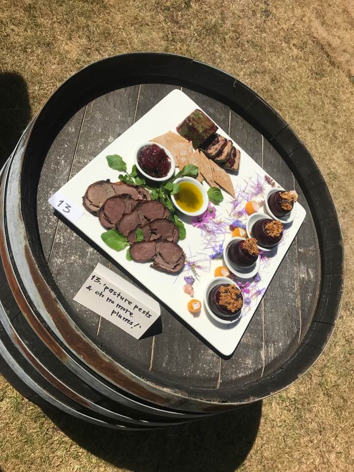 Lyndal and I entered a combined dish for the wild food festival. I made a wild plum and wild blackberry crumble inside red flesh plums with a crumble made of roasted red plums with rosemary, honey, and oats. The filling was cooked in reduced homemade elderberry wine, a hint of cardamom and rosemary, and vanilla. I also made a fresh picked yellow plum sorbet which i served inside hollowed out yellow plums with a crystallized rose petal on top. Lyndal made a possum and hare terrine, hare saddle with hare liver inside soaked in elderberry wine, wild flax seed crackers, and a couple of sauces.