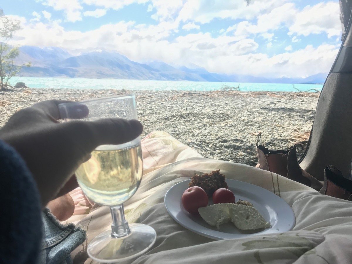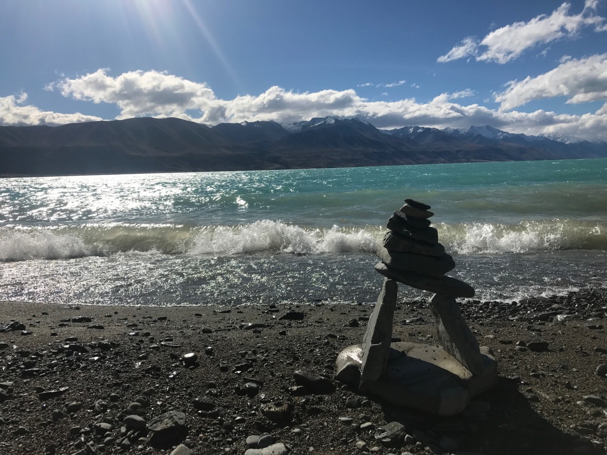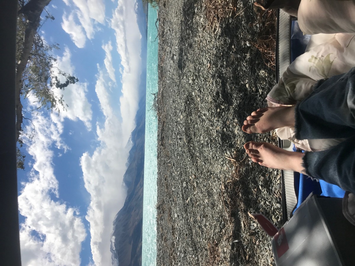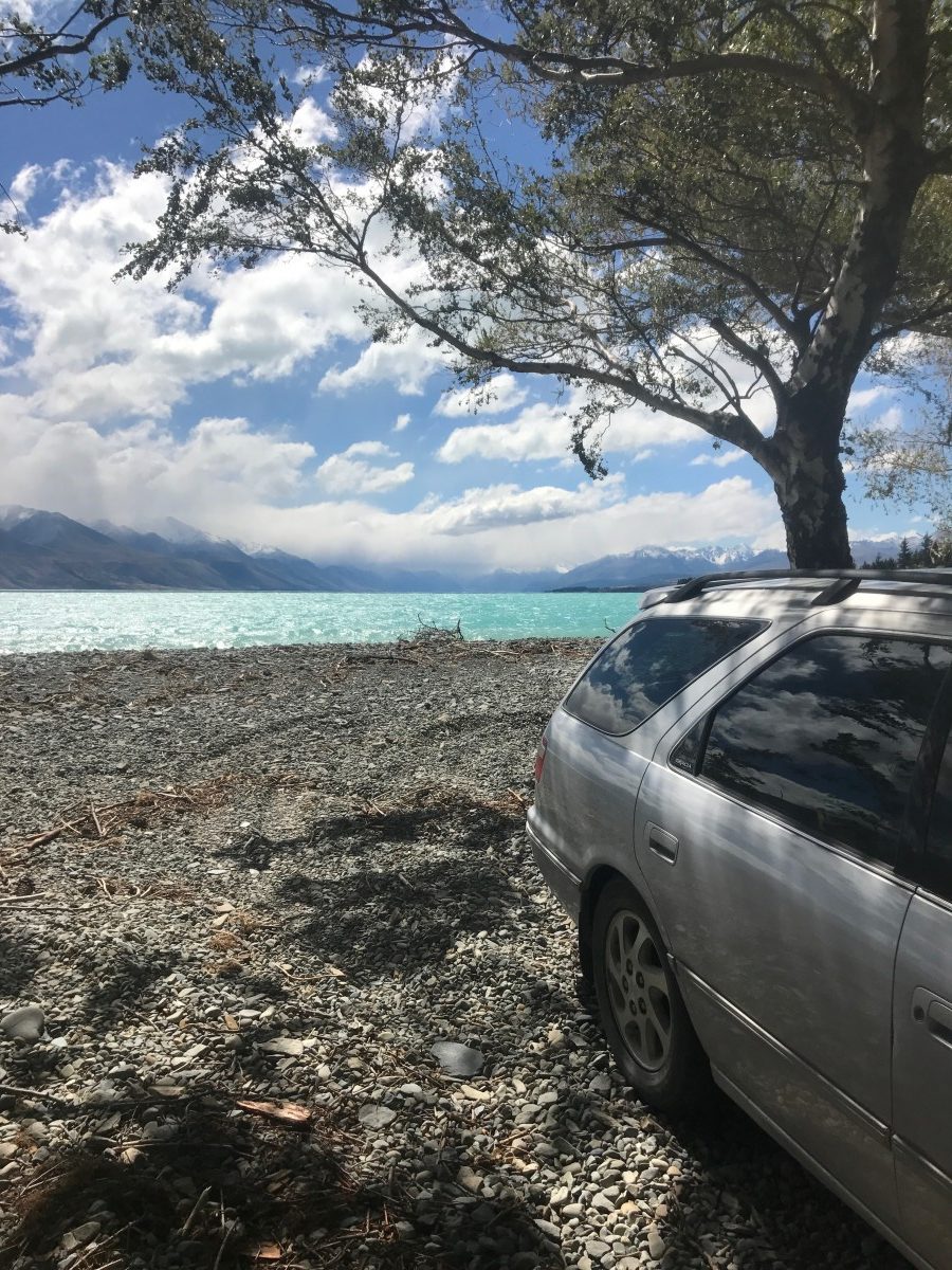 Lakeside camp spot at Lake Pukaki with a view of Mt. Cook