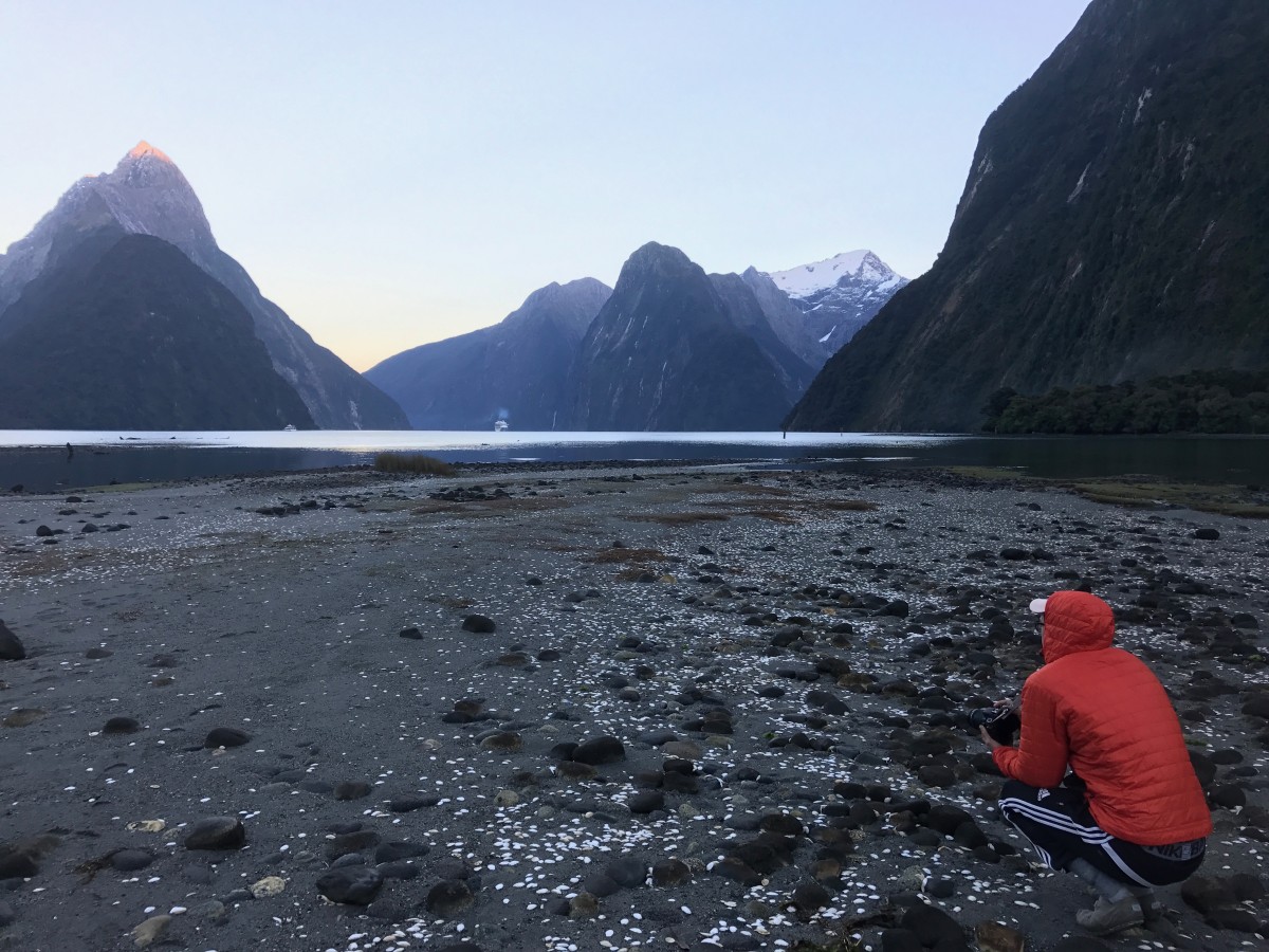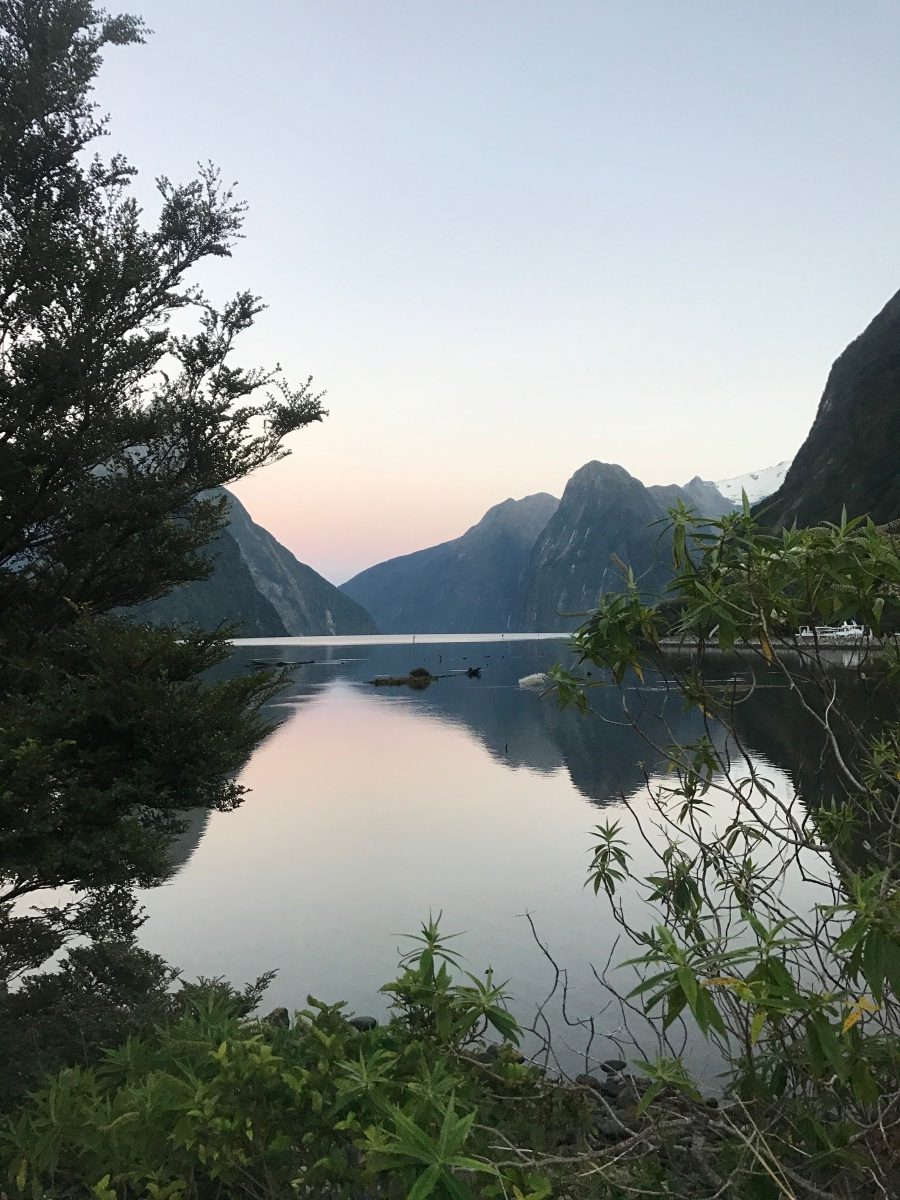 Milford sound at sunrise. The peak in the middle is considered one of the 8th wonders of the world.