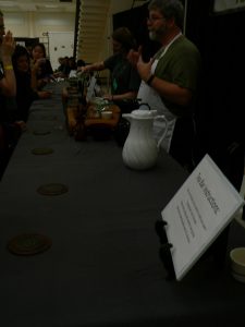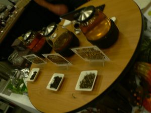 My rounds at the high speed “tea bar” sessions, in chronological order, were a comparison of two green teas that were fairly light in flavor, 2 aged oolongs of the woody/mushroomy variety, very recently imported powdered yak butter tea (one “salt”, the other “sweet”), pu-erh aged in dried citrus fruit claimed to having medicinal properties, and two consecutive years of a Taiwanese black tea from Sun Moon Lake which was produced from an irregular cultivar or subspecies and typified  as a Ruby Red tea, which there are quite a few different producers producing wildly different results.