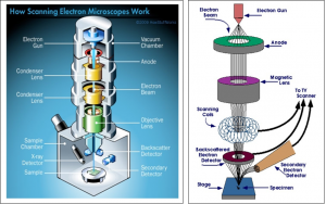 Basically, the scanning electron microscope fires a beam of electrons through a filament down at the sample you have staged. The electrons are kept in alignment through a series of alignment coils and condenser lenses which allow for a more concentrated beam making contact with the sample. As the electrons make contact with the sample, they begin to replace electrons from the atoms of the sample, itself. As these electrons from the sample are “deflected,” an electron detector collects them and begins to translate that as an image displayed on a computer screen. Simple enough in a sense.