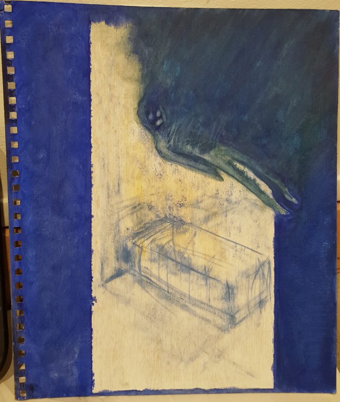 In my pieces, Jerry pointed out that a common theme between the pieces besides the blue figure was the inner framing and use of shapes. That’s a theme that I could carry on through all of the pieces I think. Jack said he liked the thin blue bed lines and thought it might be good to do more of those lines. I wasn’t thinking about keeping those lines, but now I might find a way to use them.
