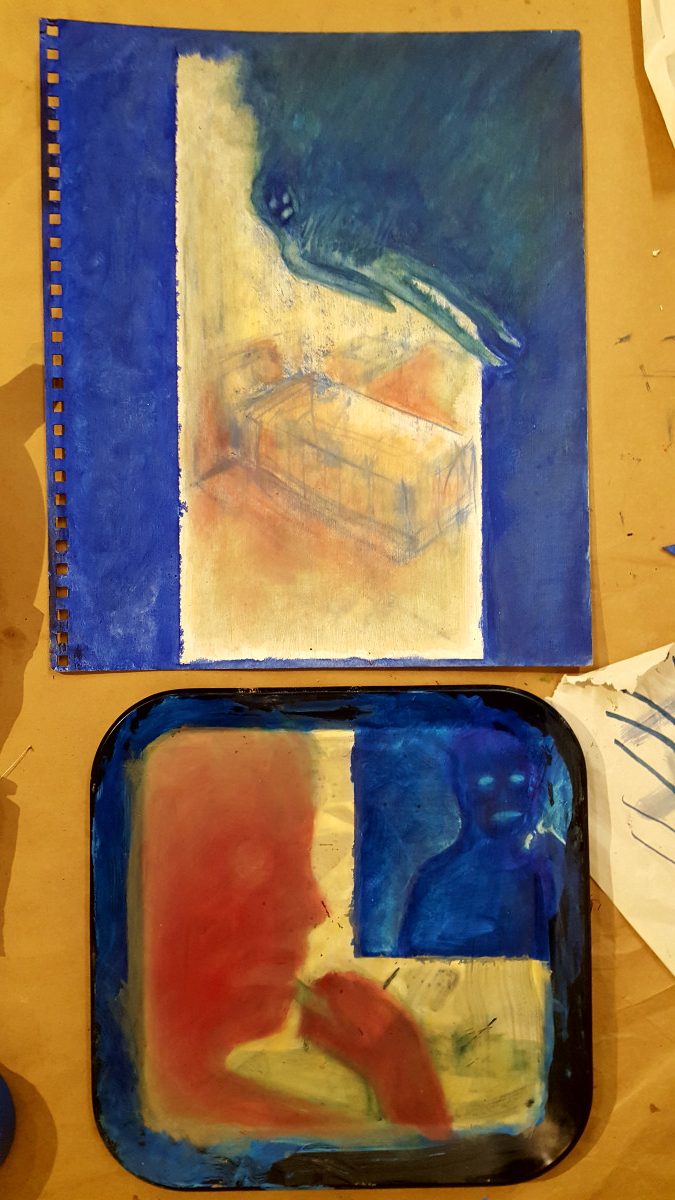 It feels like I’m experimenting every time I paint because I legitimately don’t know what I’m doing, I still feel almost blind. I think that the least experimental thing about my paintings is the subject matter, but at the same time, I’ve never committed to full images of the kind of the things I’m painting, only doodles.I think I’ve found a binding style and theme for what I’m painting now.Accidents: I used gamsol to make the subtle smokey and stained look of the bedroom painting.Sloppy Gesso on the reflection painting made an interesting under texture. I wished that I put more on the edges so that more color would show through there.I used green on the reflection painting figure to plan out my next move but the green looks nice under the red. It makes a subtle glow and outline too. Originally I was going to paint a more bland and realistic character but I like what I got here and don’t think I want to do any bland or realistic painting at all. Plus, I still want to move away from the depression vibe. - Describe and reflect on the feedback you received on your work in critiques. What feedback did you take forward from week to week?Common shapes, framing, same colors, a sense of dissociation, confusion of what was being depicted, texture of movement (in reflection painting) and wood (bedroom painting).I will definitely take the common shapes and framing forward. I want to leave dissociation and confusion behind.