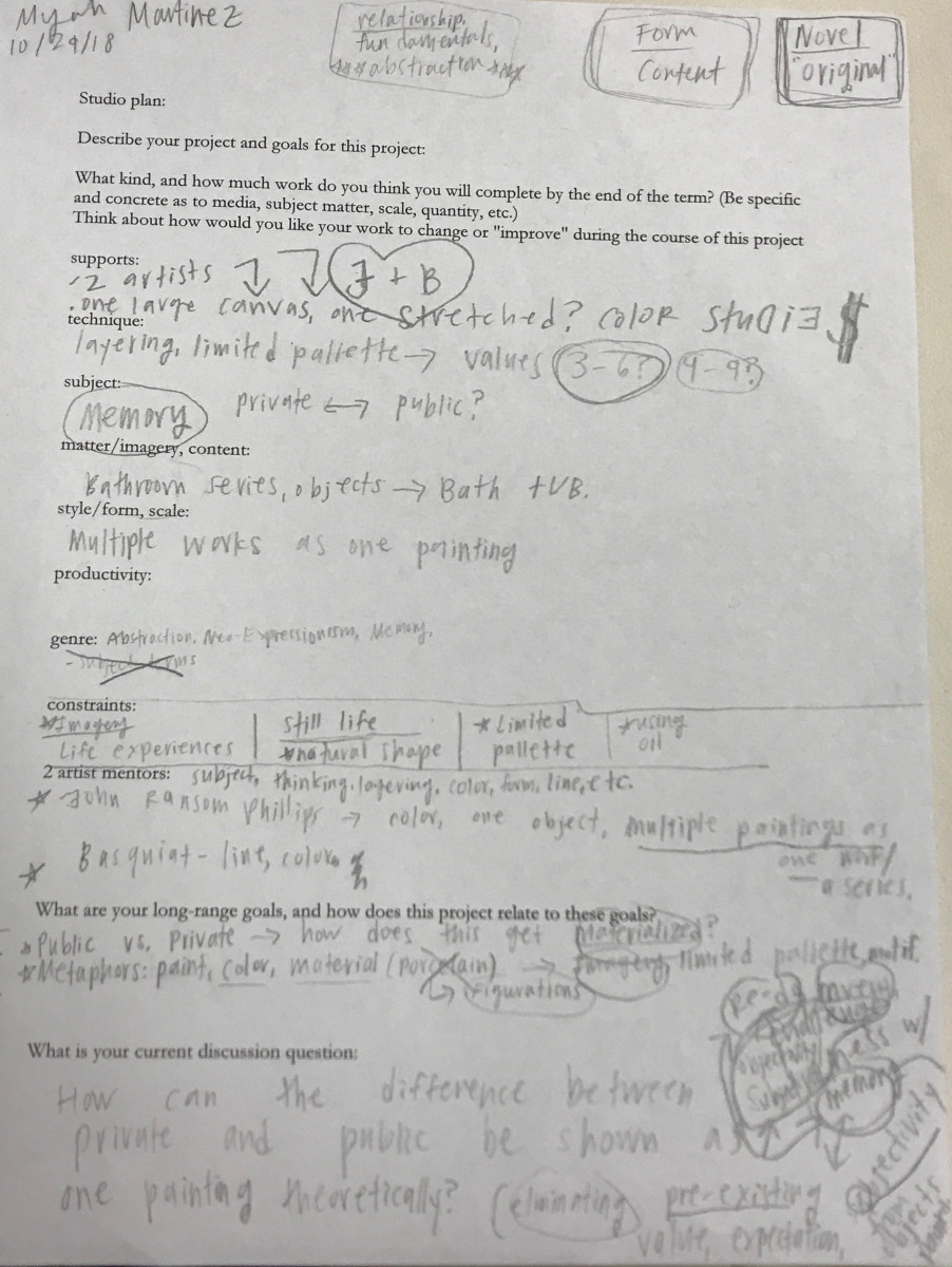 On Wednesday our Maureen Gallace copies were due for critique. For my direct painting (top image), I painted on top of canvas paper and started with layering colors followed by creating texture with my fingers and the ends of my brushes. For my indirect/personal copy (bottom image), I went straight for the color and challenged the scale and composition of the painting. I naturally see the color tones which make up the finishing layers of a painting and have a hard time layering. This was my biggest struggle in the direct piece- not breaking the rules and having to wait for the oil to dry and say goodbye to my beautiful dark moody pink and tan tones. I definitely learned how to become patient by using medium for drying, applying thinner paint, and realizing how powerful white titanium is in oil painting. I learned more of a structural/organizational approach to painting too. I put my best effort into detail work and texture in my painting with a deep emphasis on color and trying to keep the original hues present in the finished work. Reflecting onto week four, I still need to practice being more vocal and not waiting to speak up in lecture or critique. I also need to catch up with my group as we are slightly falling behind. The past weeks have been very difficult but I am still pushing to my ability!