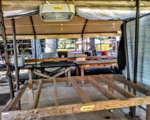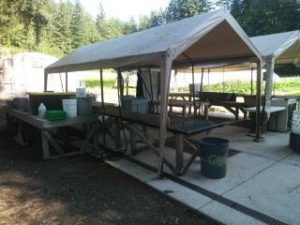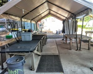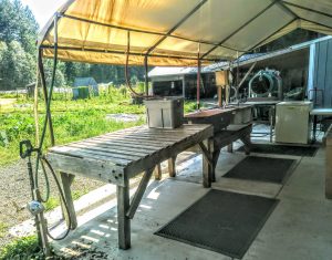 We designated the first table in the flow to be “produce drop off.” This is the students’ first stop when they come back from the field. From here they decide where to go next. Salad mix, for example, goes through the iron tub, the bubbler, the spinner, and the dryer before it is bagged – so we placed those stations in the appropriate order: