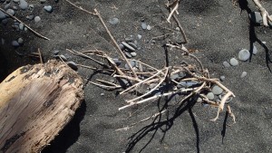 A variety of compositional elements on the beach including: sand, course woody debris, and pebbles.
