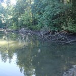 There were many salmonberry bushes on the brink of ripening. The sides of the boardwalk were covered with a white fuzzy cottonwood pollen, as were many of the bodies of water. We noticed that the vegetation was incredibly lush, and all of the various waterways were littered with lots of woody debris as well as skunk cabbage. This river is probably mostly comprised of snow melt traveling from Mount Rainier, combining forces with debris to provide a cool, calm and sheltered pathway for salmon and a living area for non-anadromous fish.