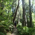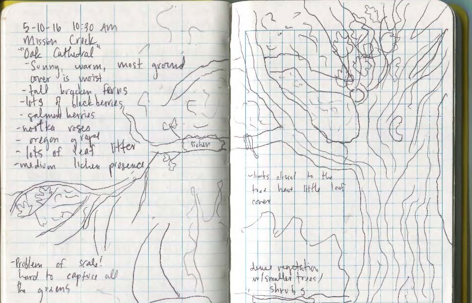 The park seemed highly maintained by humans, as there was a lot of intentional landscaping at the beginning of the trail to the “Cathedral.” Most of the ground cover was moist despite the heat. There are many Bracken Ferns (most of which are almost as tall as our group members, if not taller), black, thimble and salmon berry bushes. Included in the ample leaf litter is Oregon Grape, Pacific Waterleaf, Three Leaved Anemones, and Creeping Buttercup. There was a moderate amount of lichen, but nothing compared to the coast. Most of the plants are common in moist and shady sites, and there is evidence that periodically there is water held in parts of the site that look like dry creek beds; my contention is that it floods often with regular rainfall.