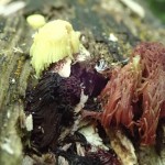 There is noticeable “green noise,” as the forest floor is covered with dense vegetation, including tons of Sword Fern and Stinging Nettles, who like the moist soil. There is also a lot of climbing ivy as well as various moss and lichen species. Also included are: Piggyback Plant, Broad-leaved Starflower, Western Trilium, False Solomon’s-Seal, Indian-plum, and Orange Trumpet Honeysuckle. There are many tree stumps in various stages of decomposition, including one covered in at least four species of slime mold. Slime molds are decomposers and were once considered fungi; as single-celled organisms, they “fruit,” like in the photos, when their food source is running out and they must combine forces to locate another (!!!!!!!!).