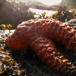 The tide pools on Rialto beach offer a much more diverse level of life than the beach south to it. Because of the mixed semi-diurnal tidal system on the west coast, the organisms here have adapted to withstand being exposed and underwater for 2 periods a day. Organisms like the Ochre Star (Pisaster Ochraceus) have adapted to the rocky intertidal zone by having hundreds of tube feet on their underside to let them grip. Ochre stars have also adapted their prey to be the abundant mussels found on the tide pools. All in all, organisms found in the tide pools at Rialto beach must be able to find food and a place to hold on. This environment is very stressful, yet very productive. This is because of the amount of food and sediment being brought in from the forest streams and the ocean currents. Rialto beach and tide pools may not seem very productive, but it is a highly functioning ecosystem.